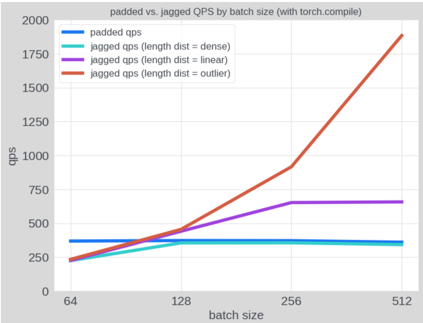 正如预期的那样,与填充张量相比,NJT 在具有不均匀序列长度的输入上表现出显着更高的吞吐量。在下图中,我们使用各种序列长度模式的合成数据评估了 QPS:(1) “密集”批次,其中每个序列的长度为 256;(2) “线性”批次,其中批次中的序列长度从 1 线性增加到 256;以及 (3) “异常值”批次,其中一个序列的长度为 256,其余序列的长度为 1。在使用填充张量时,所有三种情况的推理成本保持不变,而使用 NJT 时,推理成本随着批次稀疏性的增加而降低。在“线性”分布上,NJT 的性能优于填充张量约 1.85 倍。
