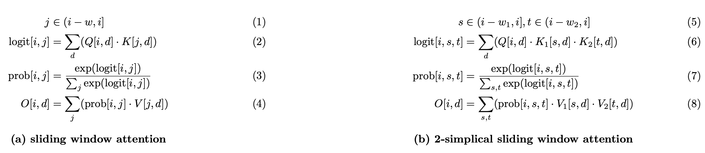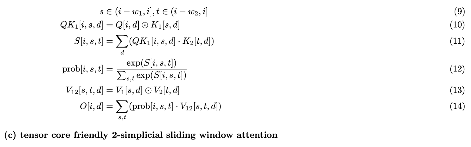 这种重新表述(如 公式 (c) 所示)将 2-单纯滑动窗口注意力转换为 Tensor Core 友好 的设计,并保持了数学等价性。