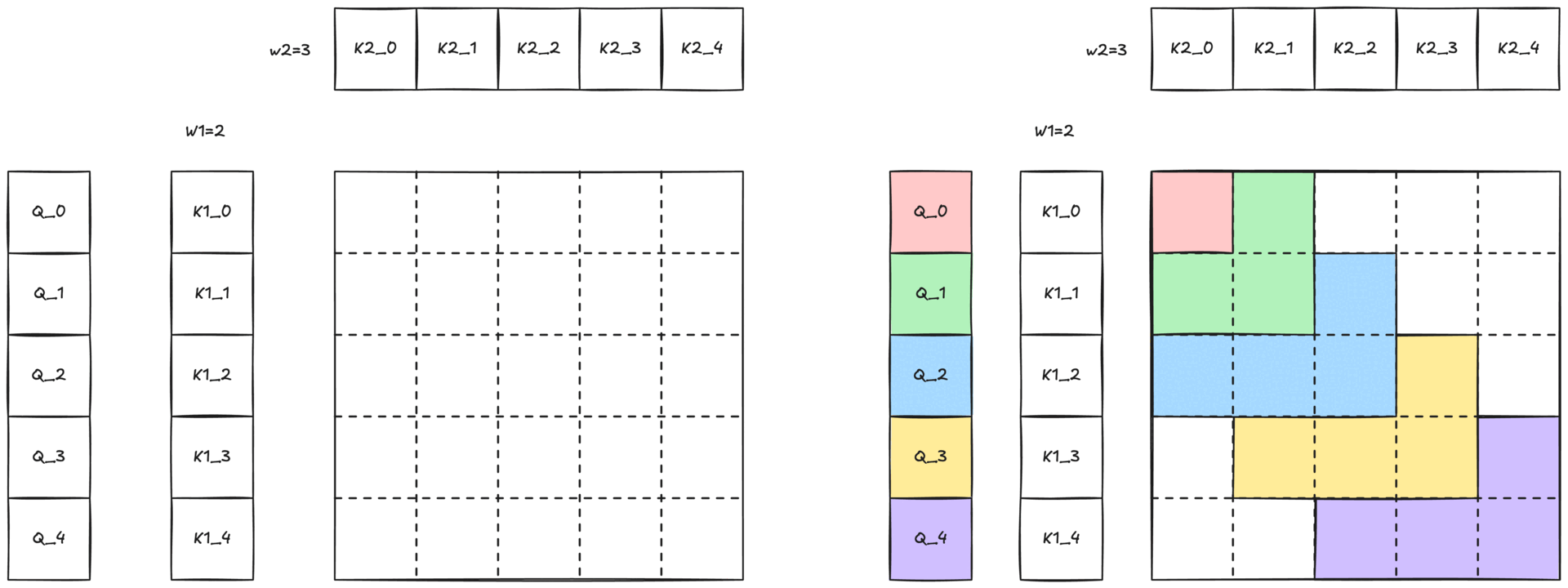 - 当 W1 ≤ N < W2 时:该机制在 W1 上作为 1D 滑动窗口运行,在 W2 上作为 1D 因果注意力运行。
