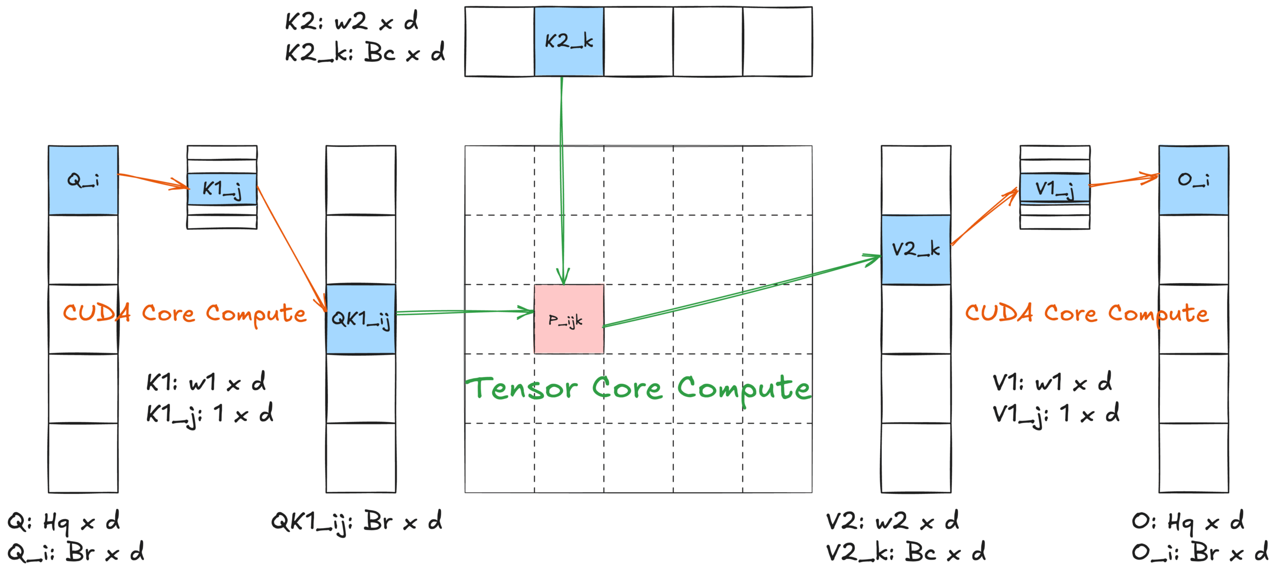 - 首先,我们预计算 Q[i] 和 K1[s] 的元素乘积(公式 (c) 第 10 行),从而实现后续与 K2[t] 的乘法(公式 (c) 第 11 行)的 Tensor Core 计算。