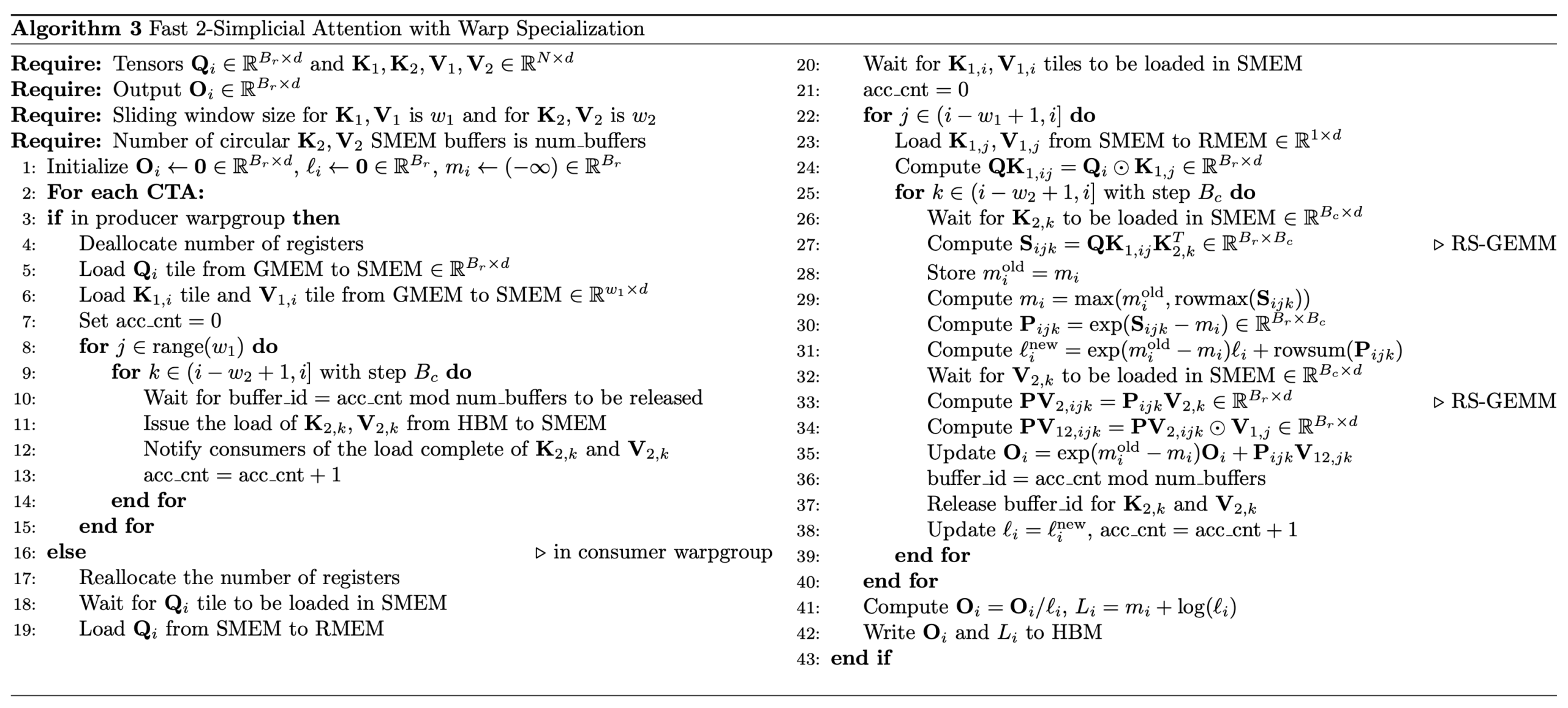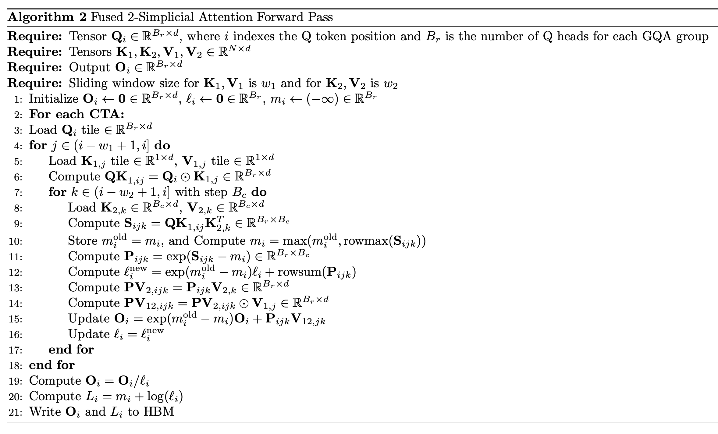 基于所有这些特性和 FlashAttention2 [3] 算法,我们实施了融合的 2-单纯注意力内核算法——算法 2。与点积注意力相比,它引入了两个嵌套的 w1 和 w2 内循环,其中最内层循环与 FlashAttention2 的内循环非常相似。