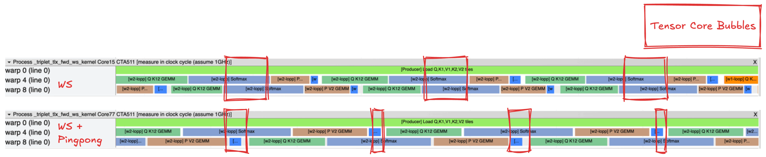 图 6:内核 1 WS(顶部)和内核 3 WS + 乒乓(底部)的 Tensor Core 气泡示意图
