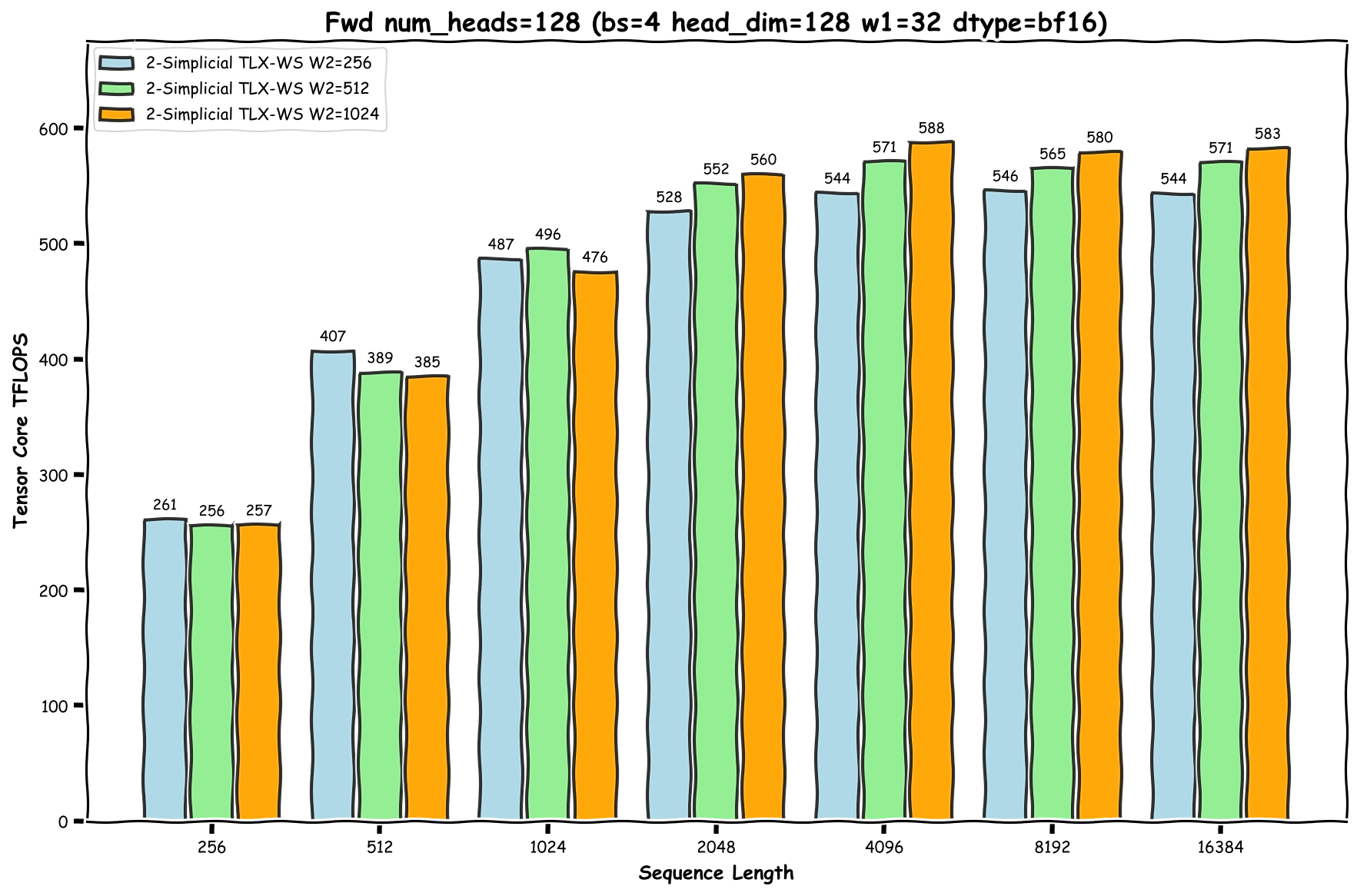 我们的快速 2-单纯 TLX-WS(内核 1)内核实现了与 FA TLX-WS 几乎相同的峰值 TFLOPs。剩余的性能差距主要源于计算流水线和乒乓优化尚未在 2-单纯注意力内核中完全发挥作用,这是我们计划在未来工作中解决的领域。