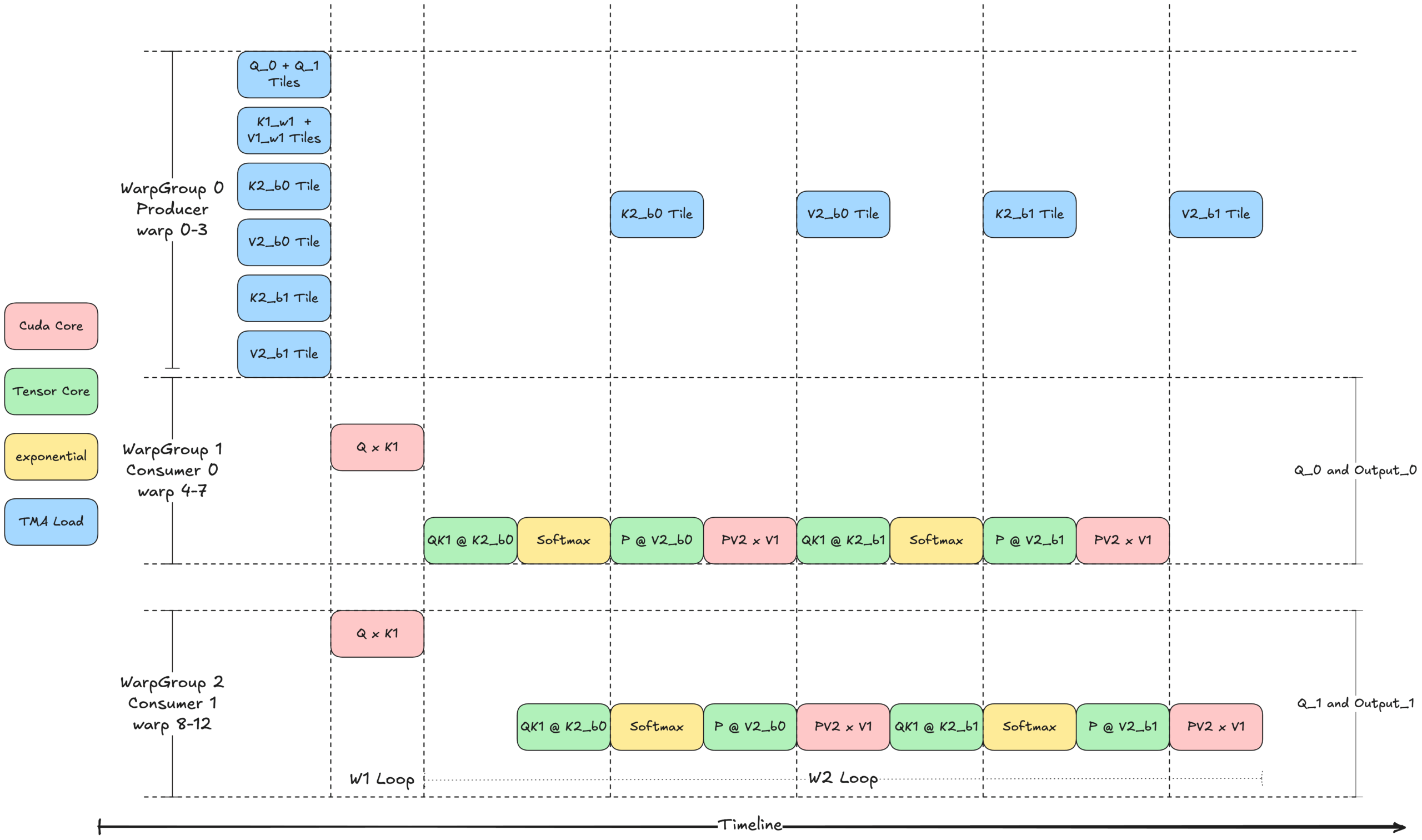 每个消费者组在不同的 Q 瓦片上操作,但共享相同的 K1、V1、K2 和 V2 瓦片,同时为不同的输出瓦片生成结果。为了最大限度地提高效率,乒乓调度确保在任何时候只有一个 warp 组执行 Tensor Core (WGMMA) 操作。