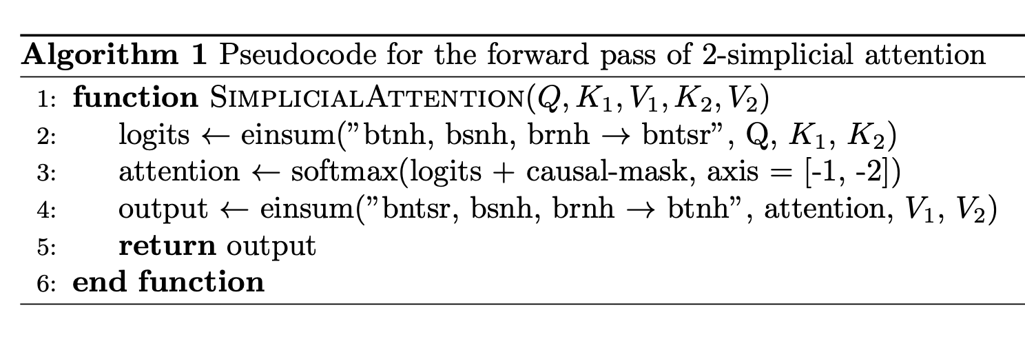 随着大型语言模型的不断扩展,获取足够高质量的训练词元变得越来越具有挑战性。提高注意力机制的词元效率对于解决这个问题至关重要。一个很有前途的进展是 2-单纯注意力(算法 1),它使用三线性函数来建模查询与两组键(K1、K2)和两组值(V1、V2)之间的交互,以建模词元三元组之间复杂的交互,而不是像标准点积注意力那样只建模词元对。正如论文《逻辑与 2-单纯 Transformer》[3] 中首次提出的那样,2-单纯注意力在基本保持原始模型大小的同时增加了注意力的 TFLOPs。根据缩放律实验,2-单纯注意力在词元效率方面显示出显著改进,特别是在数学和逻辑问题解决等推理任务中。