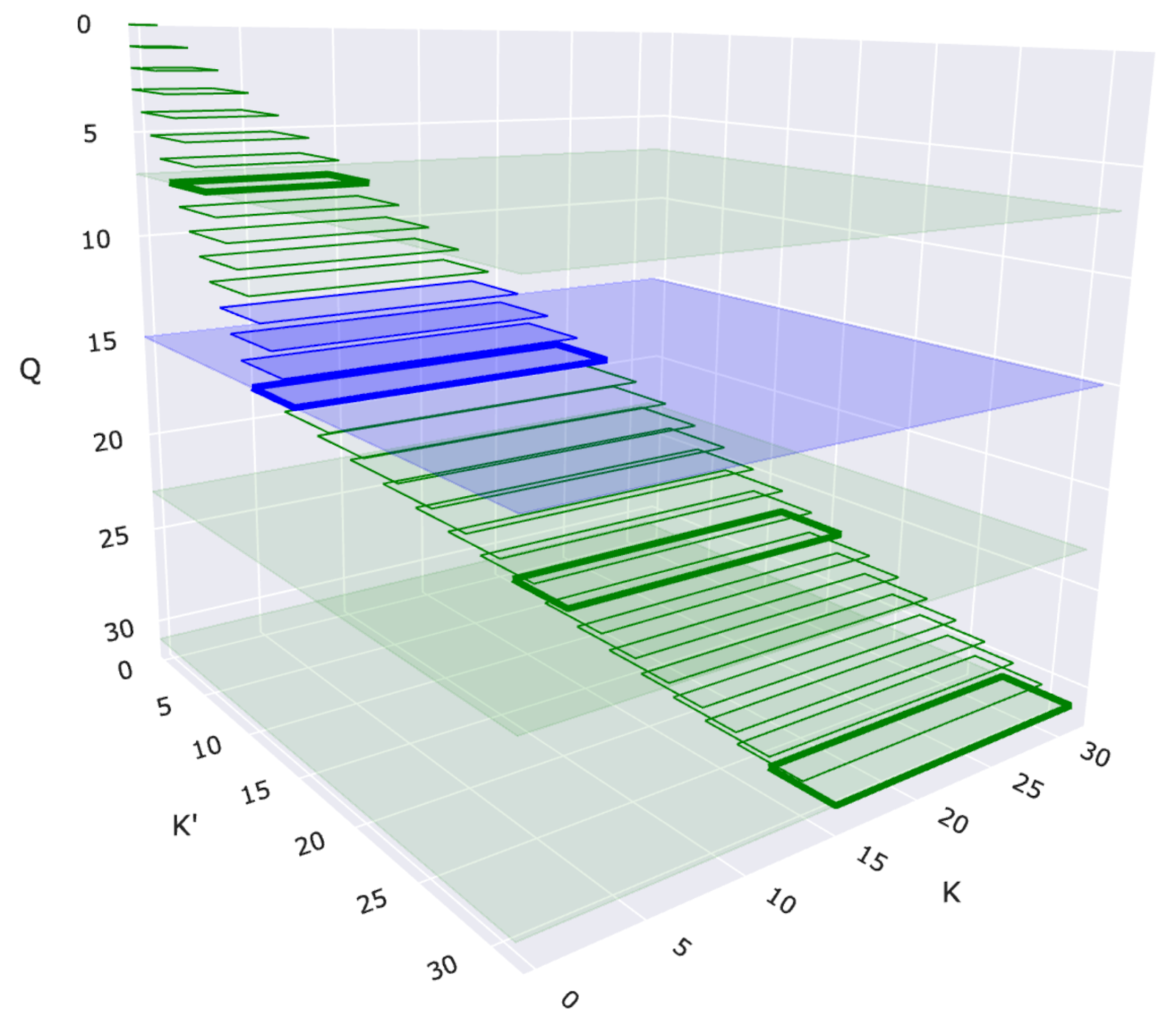 图 1:带有二维滑动窗口的 2-单纯注意力可视化。每个矩形表示一个查询 (Q) 和一对键 (K' 和 K) 之间的交互。蓝色矩形突出显示滑动窗口结构中特定的查询-键对交互。