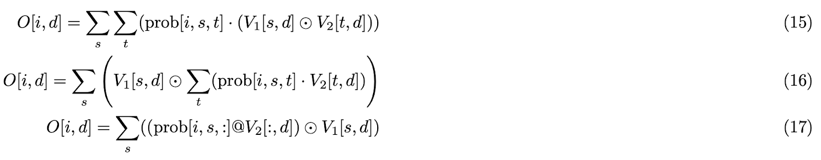 - 类似地,我们预计算 V1[s] 和 V2[t] 的元素乘积(公式 (c) 第 13 行),允许高效地使用组合的 V12[s][t] 进行 P 的 Tensor Core 计算(公式 (c) 第 14 行)。