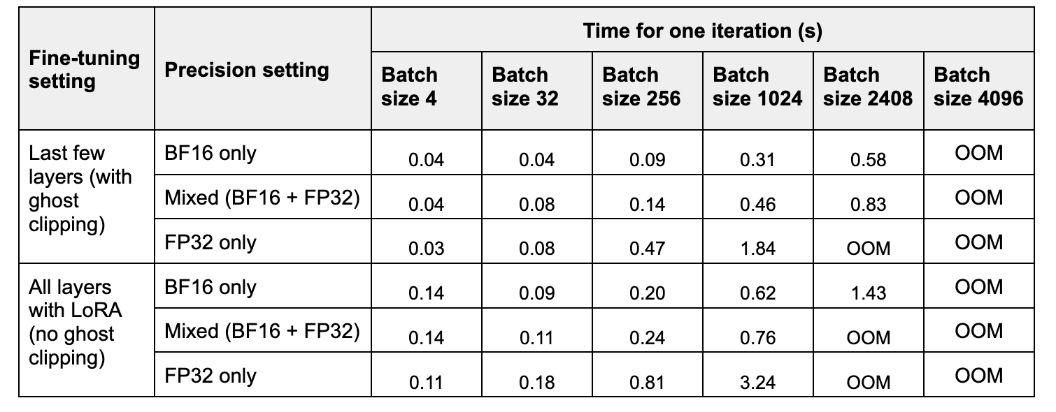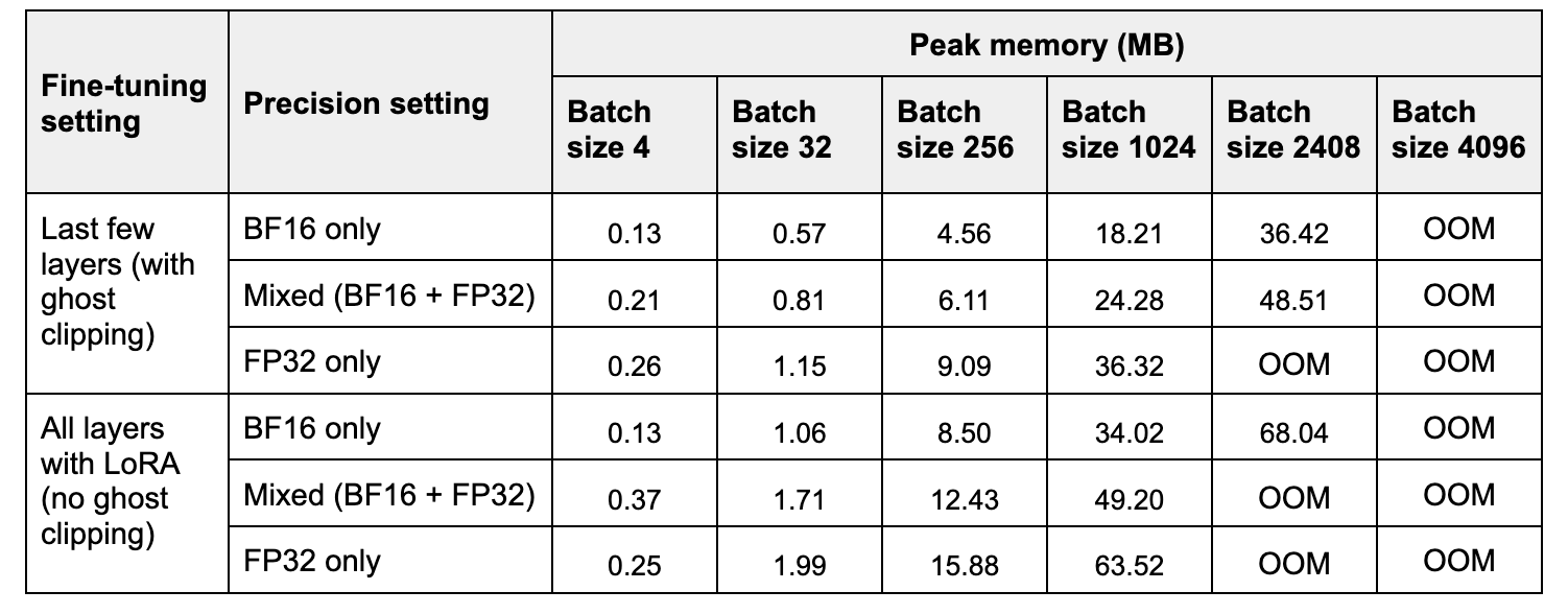在第一种情况下,鉴于线性层的宽度很大,幽灵裁剪可以改善内存使用。在第二种情况下,由于 LoRA 的有效层宽度非常小,幽灵裁剪没有用处。
