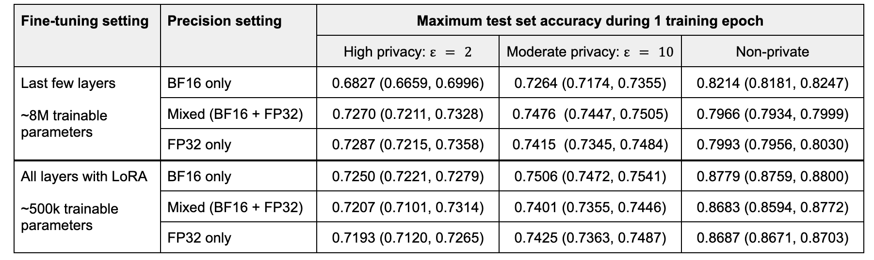 我们假设使用 DP-SGD 的低精度训练在仅微调线性层时表现最佳,如 LoRA。当微调涉及其他类型的层(例如归一化层,它们通常需要高精度操作)时,它会损害效用。