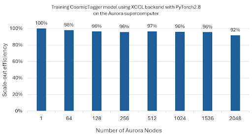 图 1:CosmicTagger 模型扩展到 2,048 个 Aurora 节点(24,576 个级别)的扩展效率结果。