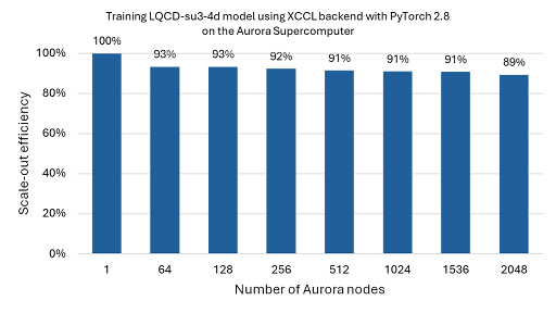 LQCD-su3-4d 模型用于高保真物理模拟,以求解夸克和胶子的量子色动力学 (QCD) 理论。我们为该模型启用了 XCCL 后端,并使用 PyTorch 的 DDP 成功地在多达 2,048 个 Aurora 节点(24,576 个级别) 上进行 FP64 精度训练,在弱扩展运行中实现了超过 89% 的扩展效率(见图 2)。