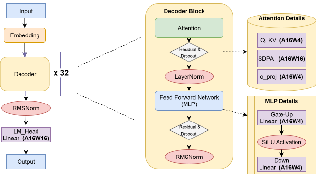 仅权重量化 (WOQ) 是一种将模型权重压缩为 4 位整数 (INT4),同时保持激活为 16 位精度 (FP16/BF16) 的技术。图 1详细展示了此过程如何在 Transformer 模型中应用。它通过解决内存带宽瓶颈来平衡效率和准确性,从而减少内存占用并加速整体性能。