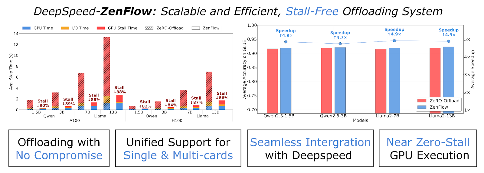 我们很高兴发布ZenFlow,它通过重要性感知流水线解耦了GPU和CPU更新。通过将CPU工作和PCIe传输与GPU计算完全重叠,我们看到了超过85%的停滞减少,以及高达5倍的加速!这确保了我们可以在享受卸载带来的内存优势的同时,不会因为较慢的硬件而牺牲训练速度。