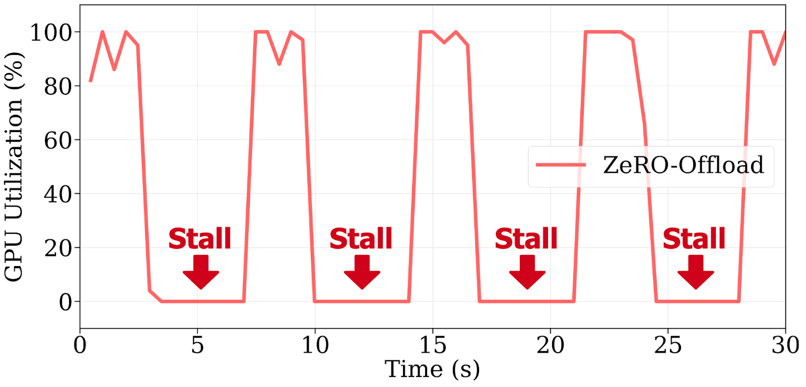 图3:在ZeRO-Offload中,CPU侧优化器更新和PCIe传输占据了迭代时间的主导地位,使GPU闲置超过5秒。