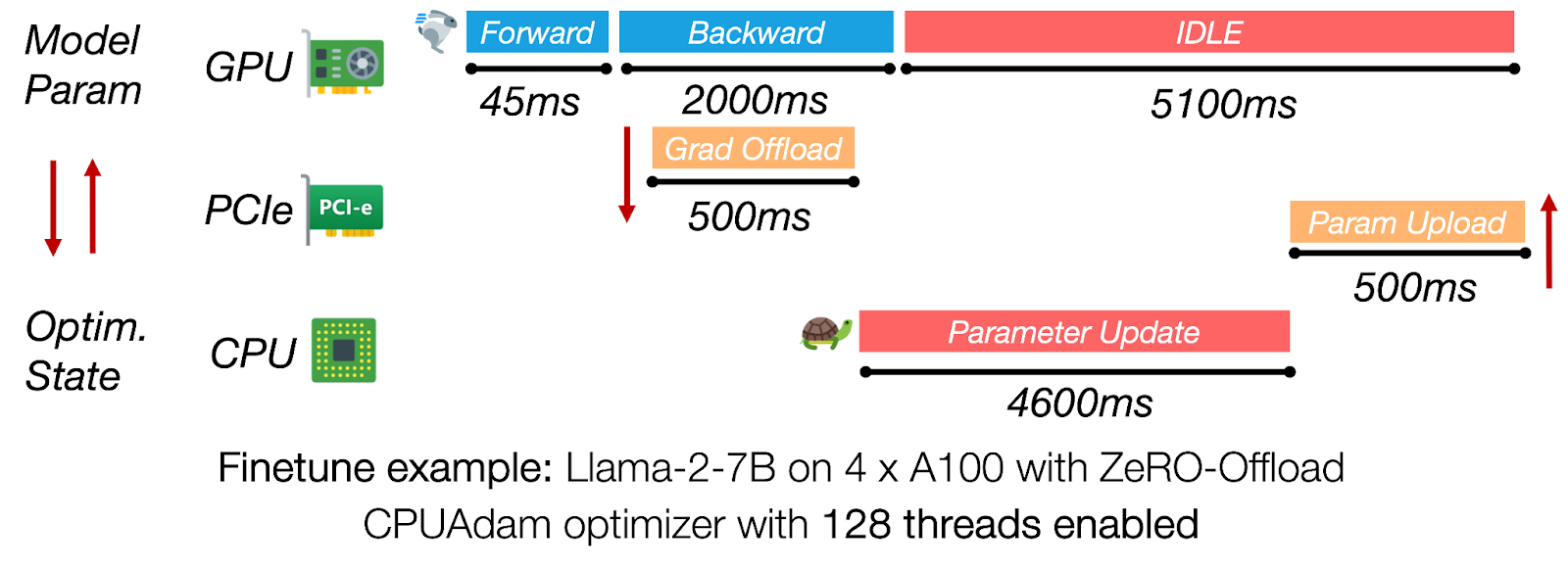 卸载已成为一种标准方法,用于将大型语言模型(LLM)的微调扩展到超出GPU内存限制。ZeRO-Offload等框架通过将梯度和优化器状态推送到CPU来减少GPU内存使用。然而,它们也创建了一个新的瓶颈:昂贵的GPU经常闲置,等待缓慢的CPU更新和PCIe数据传输。实际上,在4块A100 GPU上训练Llama 2-7B时启用卸载,可以将每步时间从0.5秒增加到7秒以上,这是一个14倍的减速。
