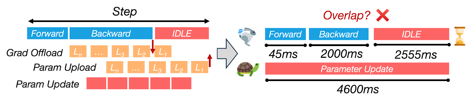 同步卸载框架(例如,ZeRO-Offload)在CPU执行完整优化器步骤并将更新的参数传输回GPU时,使GPU处于空闲状态。对于Llama-2-7B在4块A100上的训练,CPU路径可能需要超过4秒,而反向传播则需要大约2秒,因此每次迭代超过60%的时间是纯粹的GPU等待时间。消除这种序列化对于实现高GPU利用率至关重要。