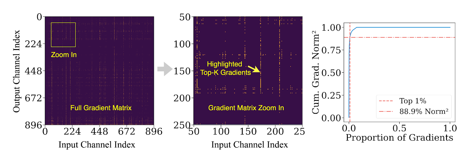 并非所有梯度都同等重要。我们的分析表明,在微调过程中,前1%的梯度通道贡献了超过90%的L²范数能量。换句话说,大多数更新对模型学习的影响很小,但在传统卸载流水线中仍会产生不成比例的高计算和I/O成本。