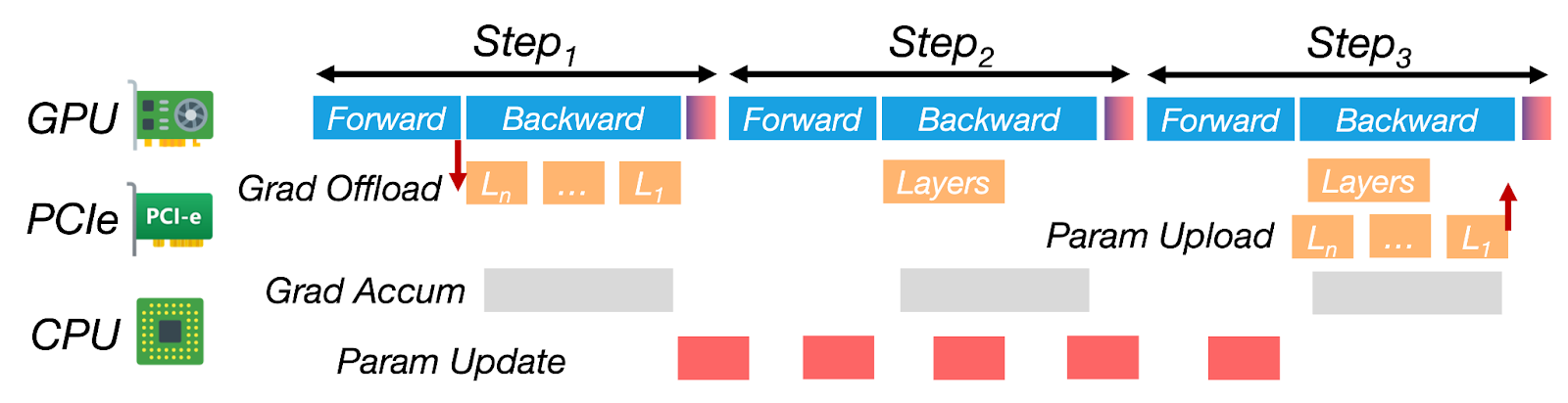 - 梯度传输到CPU: 当GPU忙碌时,来自当前迭代(或先前迭代)的梯度通过专用PCIe流传输到CPU。这与GPU计算并行进行,不会导致任何GPU等待时间。
